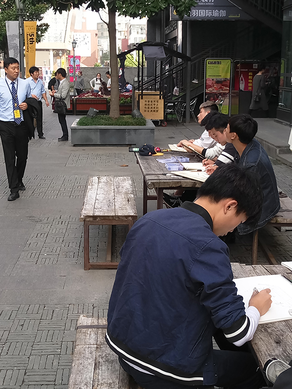 10月17日,2015级室内设计班62位师生乘坐校车🥅,来到有着“城市的名片”美誉的 “1912”进行景观造型速写的写生课,在这个现代和传统风格并存的概念街区里,同学们拿起速写本、占有利角度、寻找透视点,不一会儿马头墙、雕花门栏➔、小资情调的餐厅就在寥寥数笔中呈现出来。手绘课程需有完整的课程体系,线条、单体、小品的练习,到线稿、色稿的临摹最后写生环节🌌,训练室内专业学生的手绘创作能力,训练学生能提笔就画动手来操作软件的实战能力。