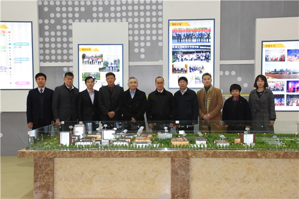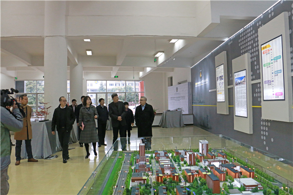 周华盛董事长一行首先参观了位于学院图书馆一楼的展厅🙅🏿♀️,参观了学院的发展历史、学子风采、校园生活、学生作品等展板,重点了解了学院新桥校区的基本概况、发展目标、建设进度以及远景规划等情况。