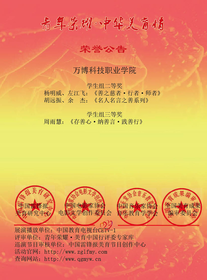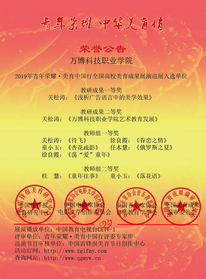 12月24日,从主办方传来喜讯,在由中国雷锋报美育研究中心、中国电影家协会电影文学创作委员会、中国音乐家协会音乐教育学学会👩🏻🦲、全国美育成果编审委员会联合主办的“2019年青年荣耀•中华美育情全国高校美育成果展演”比赛中,我院师生提交的参赛作品喜获佳绩🧖🏽♂️😷。