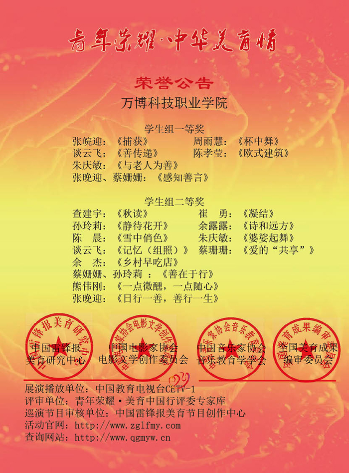 经过组委会专家评委的评审👦🏽🧑🏼💻,最终37件作品获奖,其中一等奖12项♔👴,教师组和学生组各占一半👧;二等奖16项,其中教师2项💶,学生14项;三等奖1项。本次获奖的师生🧑🏼🦳,接到主办方的邀请将于2019年参加高校美育成果的全国巡演。