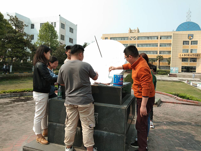 本次活动由美术协会具体组织,提前备好了工作所需的油漆👨🏿🎤、磨砂石、水粉笔、毛笔🤭👵🏼、勾线笔等各种材料和工具🧙🏼♀️。首先,用磨砂石将日晷上面凹凸不平的小颗粒进行磨平🎙,然后利用刷子均匀有力的给日晷刷上白漆,接着由书法功底和绘画功底深厚的同学将日晷上面的字迹用黑漆描绘出来➰,并将日晷上面最后一道花边用勾线笔进行点缀。经过近四个小时的奋斗🕌,通过打磨日晷上凹凸不平的小颗粒、刷漆、描绘、勾线等一系列工序后🛴🫳🏼,日晷在大家的共同努力下焕然一新。