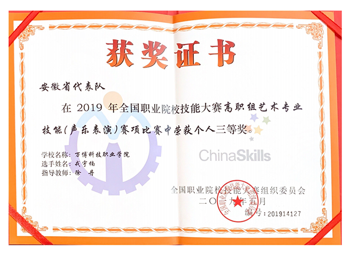 5月27-31日🧑🏿✈️,2019年全国职业院校技能大赛高职组艺术专业技能(声乐表演)赛项在北京戏曲艺术职业学院成功举办,我院2016级音乐表演专业学生戎宇楠同学代表安徽省参加国赛,并取得个人三等奖的好成绩,实现了历史性的突破🛋。