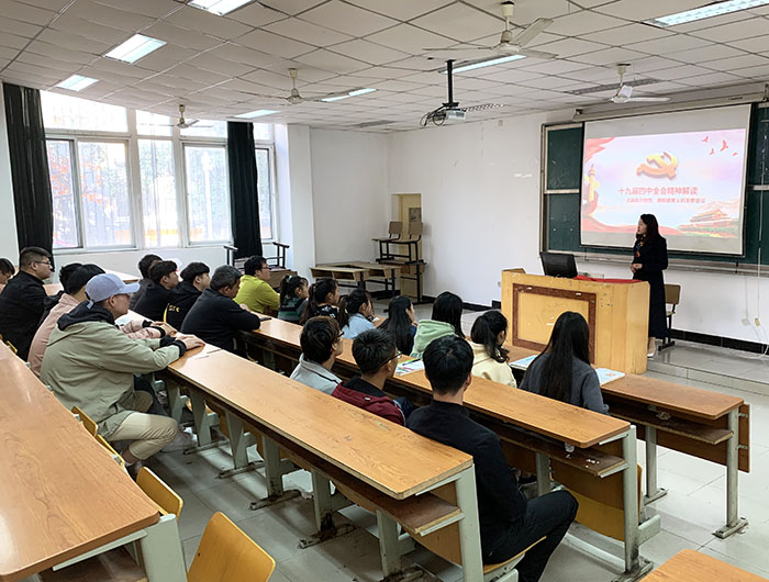 2019年11月22日中午,教学第五党支部组织全体积极分子到3101教室学习中国共产党十九届四中全会精神。支部书记朱彩娣为领学人。