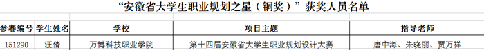 近日,“中新苏滁高新区杯”第十四届安徽省大学生职业规划大赛暨大学生创业大赛圆满落下帷幕🤚🏻,由彩神Vll交通工程学院王丹、王翠娟👉🏻、李婷婷三位老师指导的 “麦瑞婚礼公司”代表队以及智能信息学院唐中海⛓、朱晓丽、贾万祥三位老师指导的“一位追求个性化婚礼的独立婚礼策划师”个人职业规划项目,在此次比赛中均荣获省级铜奖⛲️。