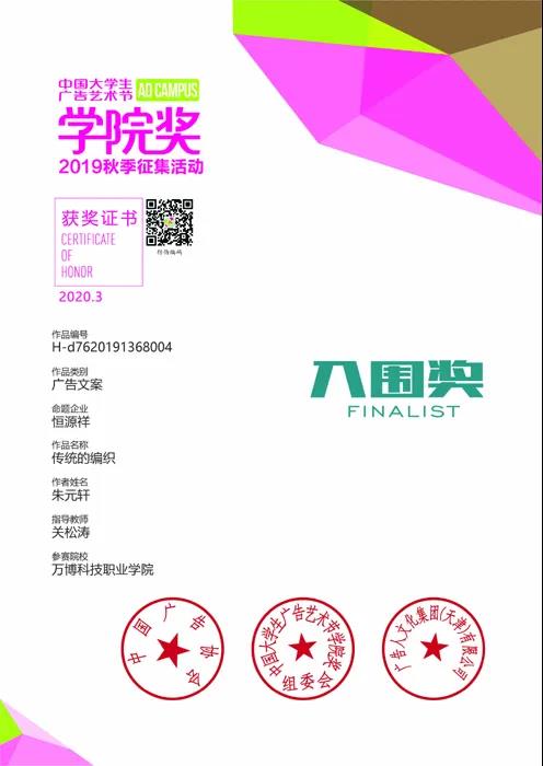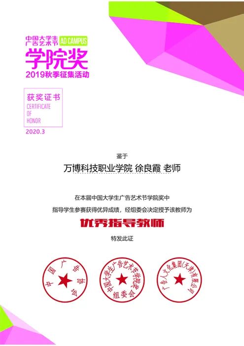 彩神Vll师生在此次比赛之中再获佳绩,在此次比赛中荣获优秀奖3项⬆️,入围奖22项;且在本次比赛中🪽,其获奖作品类型上实现了突破性的成绩,包含有广告文案、营销策划案🤹🏼、平面设计和品牌故事🤽🏿♀️📪。艺术传媒学院广告传媒教研室主任关松涛和专职教师徐良霞分别荣获第17届中国大学生广告艺术节学院奖秋季赛的优秀指导老师奖🚵🏿。此外🍖,在本次组织学生参赛中🖖🏿🚶♀️➡️,17级广告班的施健同学个人提交参赛作品有350余件🌎🫲🏻,个人累计获奖21项🔵,这也实现了彩神Vll组织学生参赛以来,在同一届赛事中单人提交参赛作品和获奖最多的突破🫠。