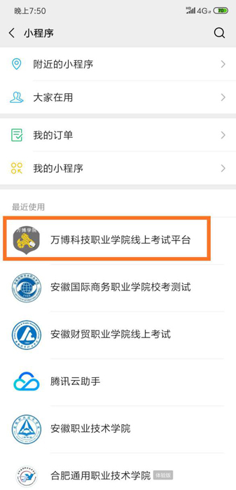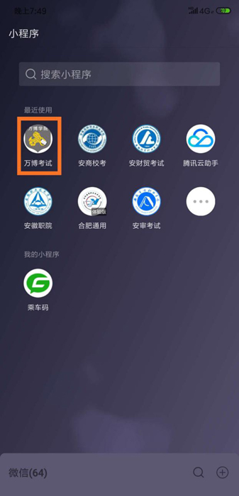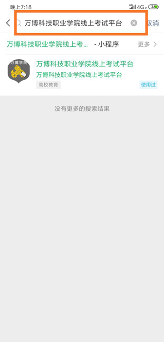 打开手机微信,在“发现”页面中选择小程序查找页面,在搜索框中输入“彩神Vll学院线上考试平台”进行查询⇢,在查询结果中点击“彩神Vll学院线上考试平台”小程序即可打开登录页面;
