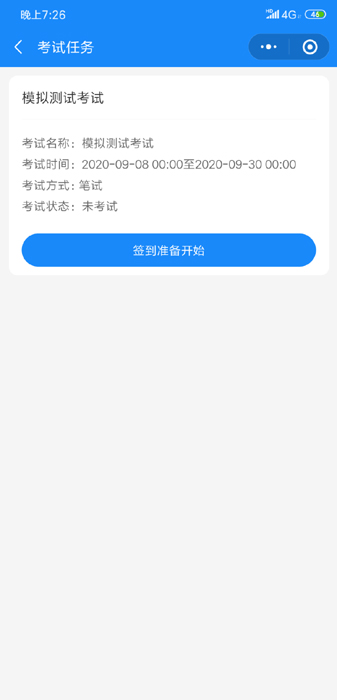 选择“考试任务”菜单🧑🏿🚒,出现考试列表页面,考生只能看到自己所对应的考试项目,在考试有效时间内点击“签到,准备考试”按键进入候考页面👨🏿🦳;