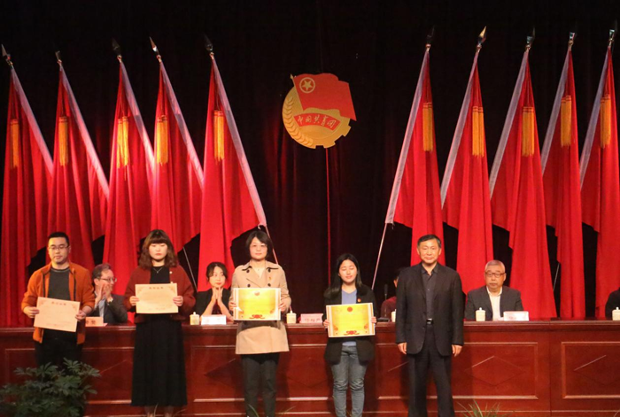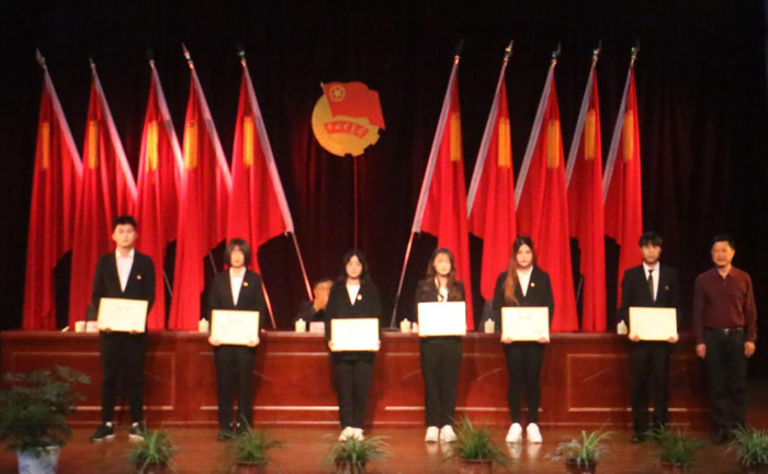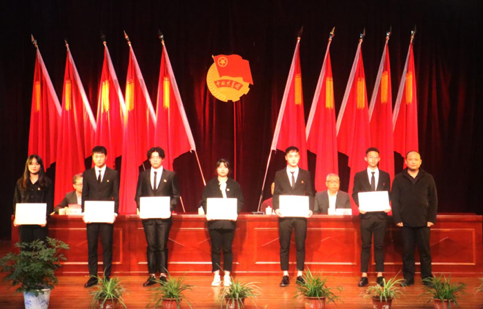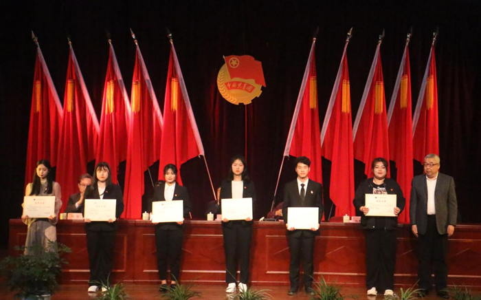 (省教育厅督导专员♋️、校党委书记汤增产为校五四红旗团总支部🛅、优秀团总支部书记代表颁发荣誉证书)