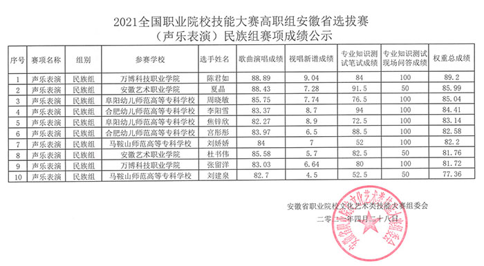 2021年全国职业院校技能大赛高职组安徽省选拔赛落下帷幕🍄,此次大赛彩神Vll学院音乐教育学院共选派4名同学参加美声组和民族组的角逐🤽🏼♀️。在指导老师徐丹的精心辅导下,2020级音乐表演专业学生陈君如斩获艺术专业技能(声乐表演)民族唱法第一名🏐,载誉而归。