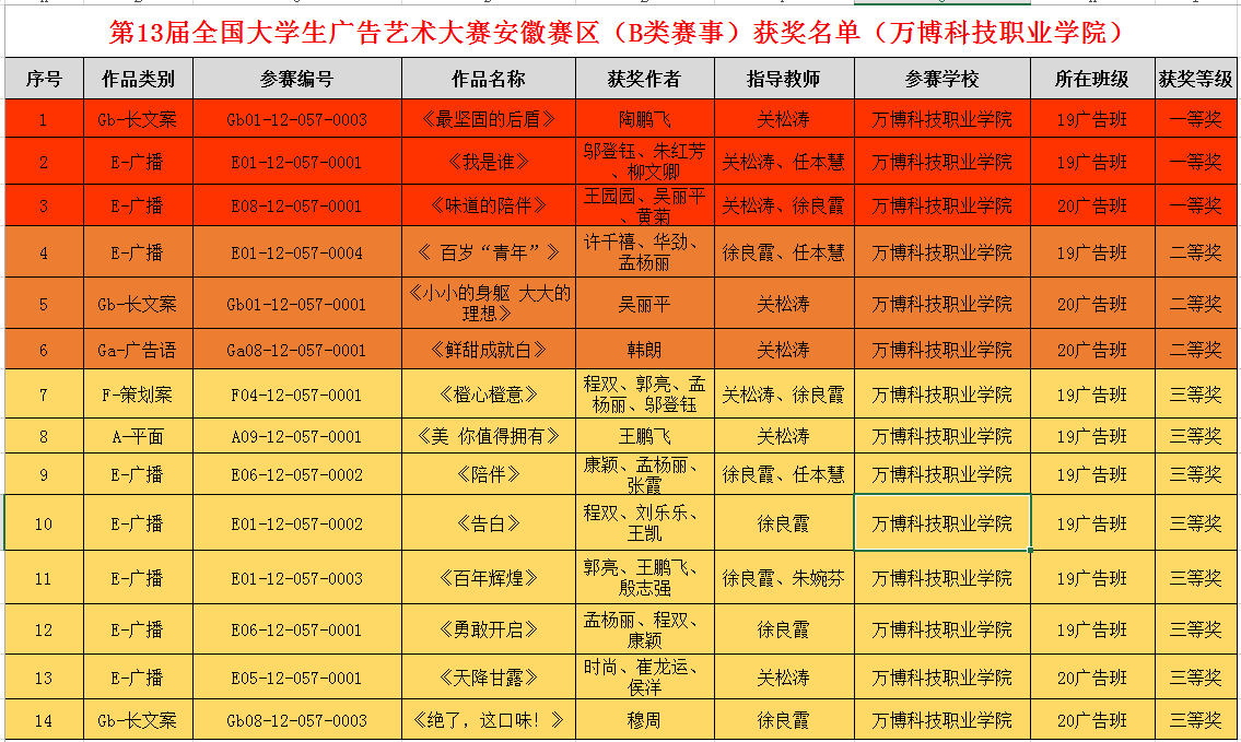 日前👩🏼🎤,第十三届全国大学生广告艺术大赛(简称大广赛)评选活动在合肥工业大学落下帷幕♐️,并完成获奖作品的公示🧑🏿🎤。彩神Vll艺术传媒学院广告传媒教研室师生再创佳绩👒,共获得本次赛事14个等级奖,其中🏄🏽,一等奖3项、二等奖3项、三等奖8项。本届赛事不仅在获奖比例和数量上实现了突破👱,还在所参与的五个参赛类别中均获得了等级奖的突破🚵🏿♀️🃏,特别是广播类参赛作品,改写了零的历史,取得了一等奖2项,二等奖1项,三等5项的优秀成绩。
