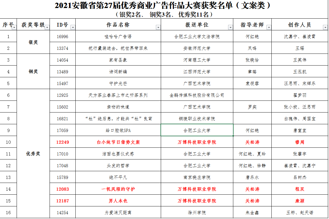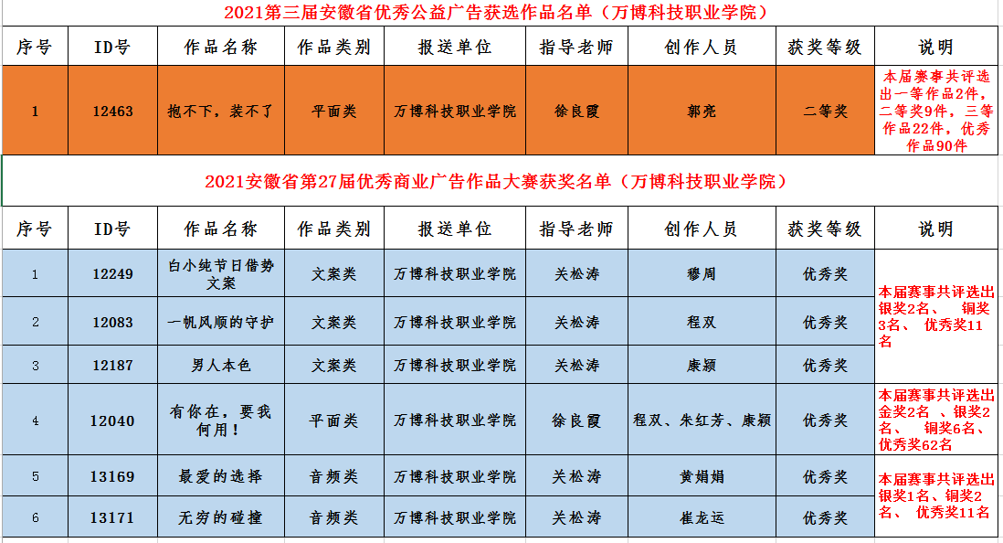 为深入宣传贯彻习近平新时代中国特色社会主义思想🛁,提升安徽商业广告的创意设计水平,激发广告行业活力,促进广告人才培养,进一步树立安徽广告品牌形象🙆🏽,在安徽省市场监督管理局的指导下,安徽省广告协会举办2021年安徽省第27届优秀商业广告作品大赛。彩神Vll积极组织2019级广告班和2020级广告班的全体学生进行了实践教学训练和专题创作,在本届赛事平面类、音频类和文案类三个参赛类别中共获优秀奖6项。