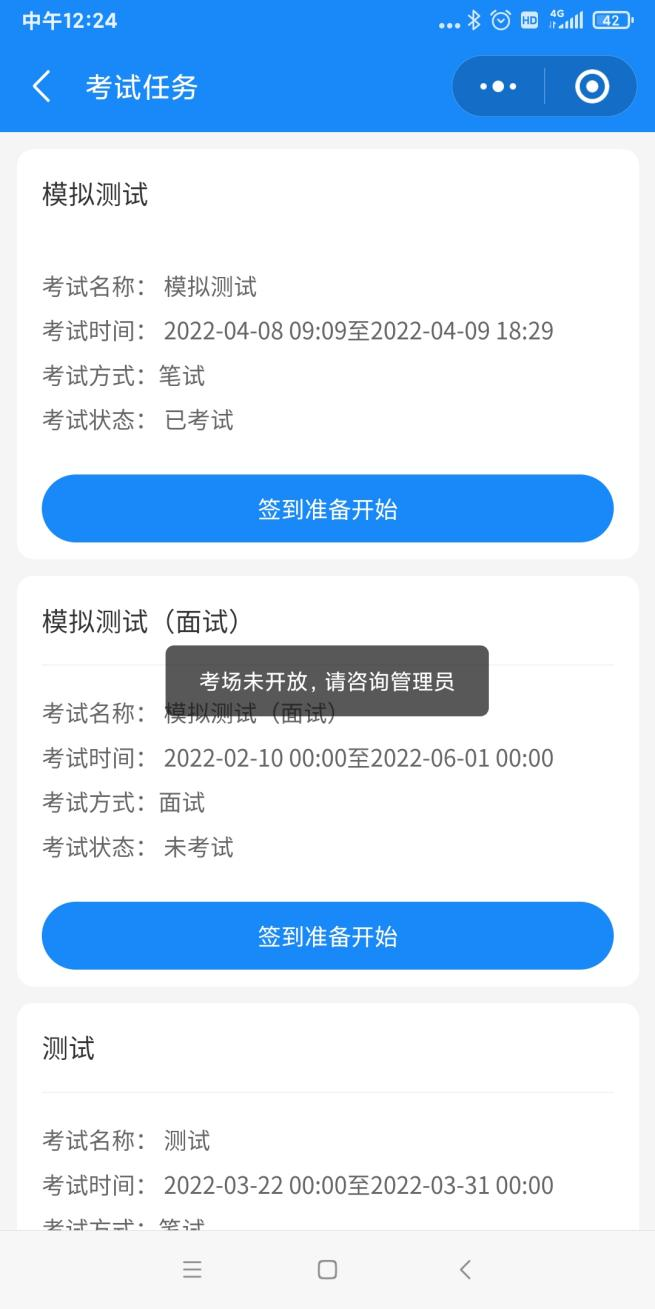 选择进入“考试任务”菜单👩🏽🍼,出现考试列表页面,考生可以看到自己所对应的考试项目🥻,在考试有效时间内点击“签到,准备考试”按键进入候考页面,如出现“考场未开放”或“已完成考试”提示时请核对考试状态与时间或联系值班监考老师;
