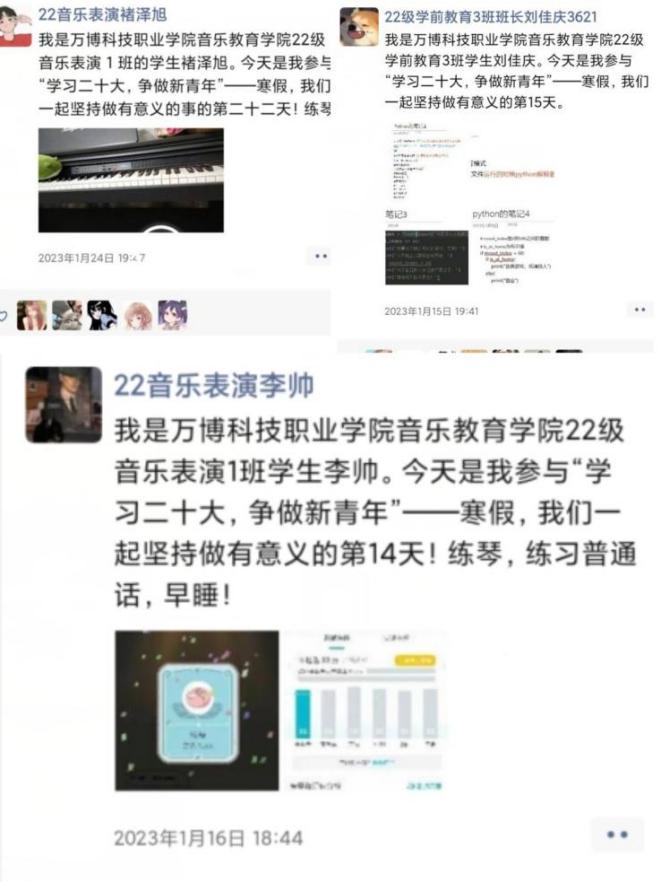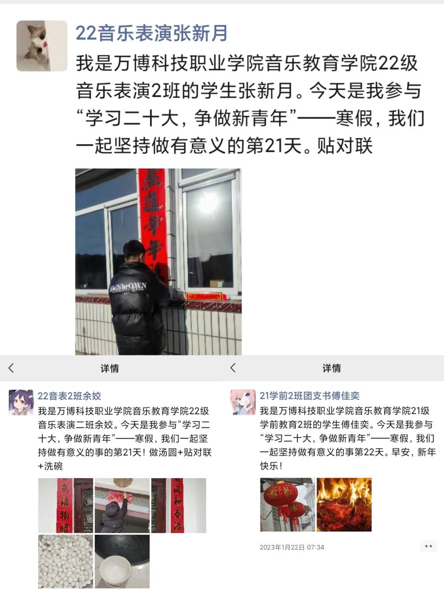 为深入学习贯彻党的二十大精神,践行服务同学根本宗旨👨🏿🦳💦,音乐教育学院团总支学生会开展了“学习二十大👩🏼🦰,争做新青年”寒假打卡活动。本次打卡活动由学习通道🚵♂️🛐、体育锻炼通道、年味通道、假期实践通道四大板块构成,旨在让学生能够从多个角度👩🏼🎓、多个通道参与到活动中。