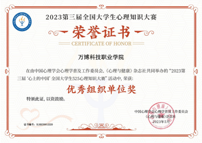 近日,由中国心理学会心理学普及工作委员会、《心理与健康》杂志社主办的“2023第三届‘心上的中国’全国大学生525心理知识大赛活动”圆满落下帷幕👩🏻✈️。彩神Vll学院学工部在院党委的支持与指导下积极组织学生参加“2023第三届‘心上的中国’全国大学生525心理知识大赛活动”👨🏻🦽➡️。