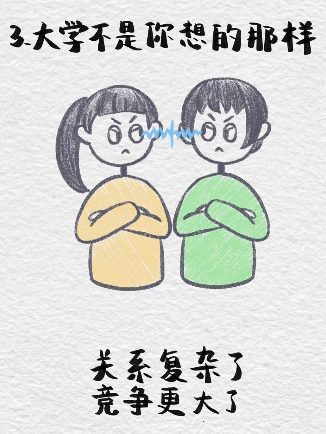 3.大学不是你想象中的那样。通过高考进入大学,是所有学子的梦想。在拿到大学通知书的时候,很多同学都会展望自己美好的大学生活,抱着憧憬👮🏿,抱着理想,甚至做好了各种攻略。可是到了大学才发现,理想和现实原来有着天壤之别👬🏻。有些人开始怀疑自己是不是上了一个“假大学”☝🏽?学习更辛苦了💴,要学习的东西更多了,竞争压力更大了🧘🏼🧑💻,人际关系更复杂了,事情都要自己做了🐲,所有的一切似乎都和自己的感觉不一样🧒🏽。