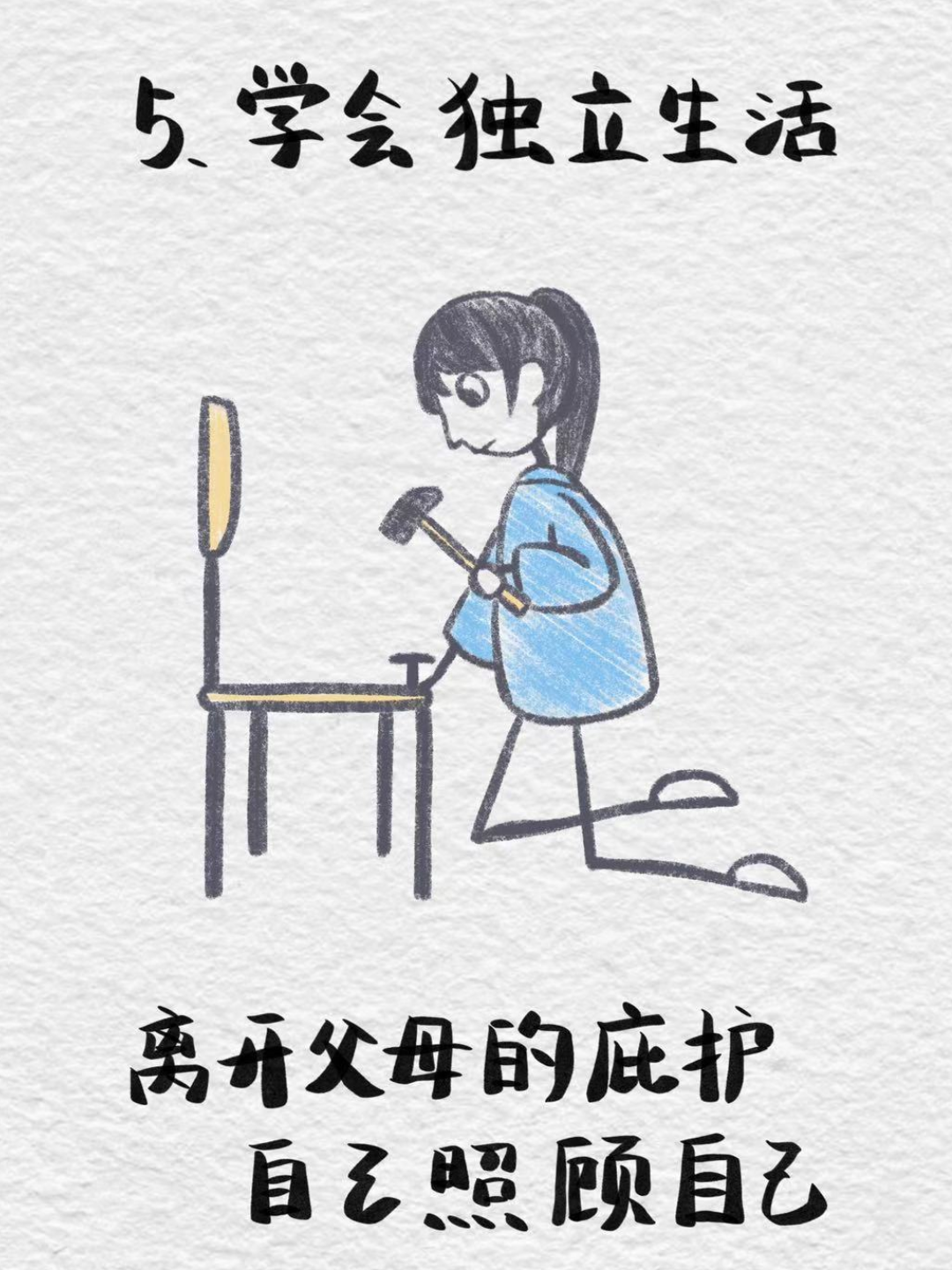 5.学着独立生活。也许曾经的你一直在父母的庇护下生活,这是你第一次住集体宿舍。来到大学👩🏻🦯➡️,你应该尽快熟悉大学生活的作息,独立整理自己的内务,独立照顾自己🤘,独立完成大学生活中的各项事务,这与有父母在身边的生活有很大不同,你不可再期待事事都有人帮忙,你应该学着长大🖍。