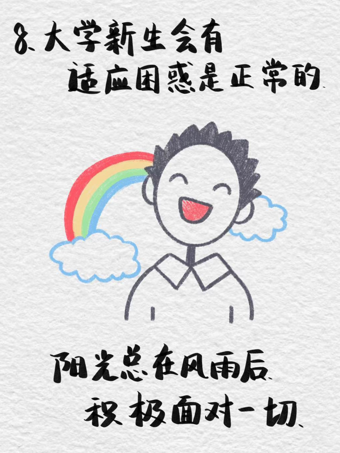 8.大学新生会有适应困惑是正常的。因为环境改变🏊🏻、理想与现实的差距、人际关系的变化、学习生活方式的变化等等因素🚶🏻♂️,导致人的心理出现暂时性的适应性困难🔫,这是非常正常的现象🧫𓀔。所以👨🏽🦳,大家也不用担心🦛,人的适应能力是很强的🪪🚣♂️,只要你以积极的心态应对,用正确的方式对待🫷🏿,这种适应困惑很快会消散。