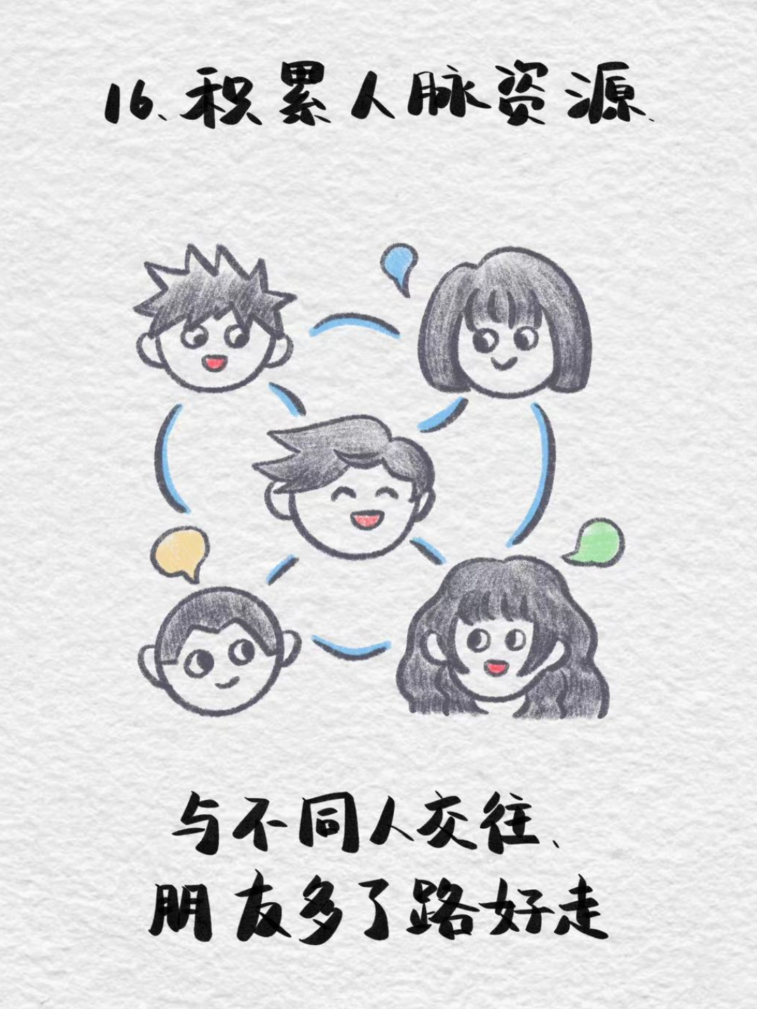 16.积累人脉资源🪺。大学是一个小社会,你要学会与不同人交往👨🏿🌾👢,积累自己的人脉资源🧍🏻♀️。你在大学里碰到的每一位老师都可以成为你的学习榜样;你身边的每一位同学都可能成为你的朋友👩🏽🦱,以后可能会帮助到你🙋🏽♀️;你实习及社会实践过程中接触的那些人,可能会成为你的同事,或者帮助你找到工作的人🚶🏻➡️;我最想说的是一定要处理好与舍友之间的关系,他们是你今后一辈子最好的朋友和贵人。另外,记得与高中同学保持联系🚕,还要记得结交新朋友。你们都懂的,朋友多了路好走。
