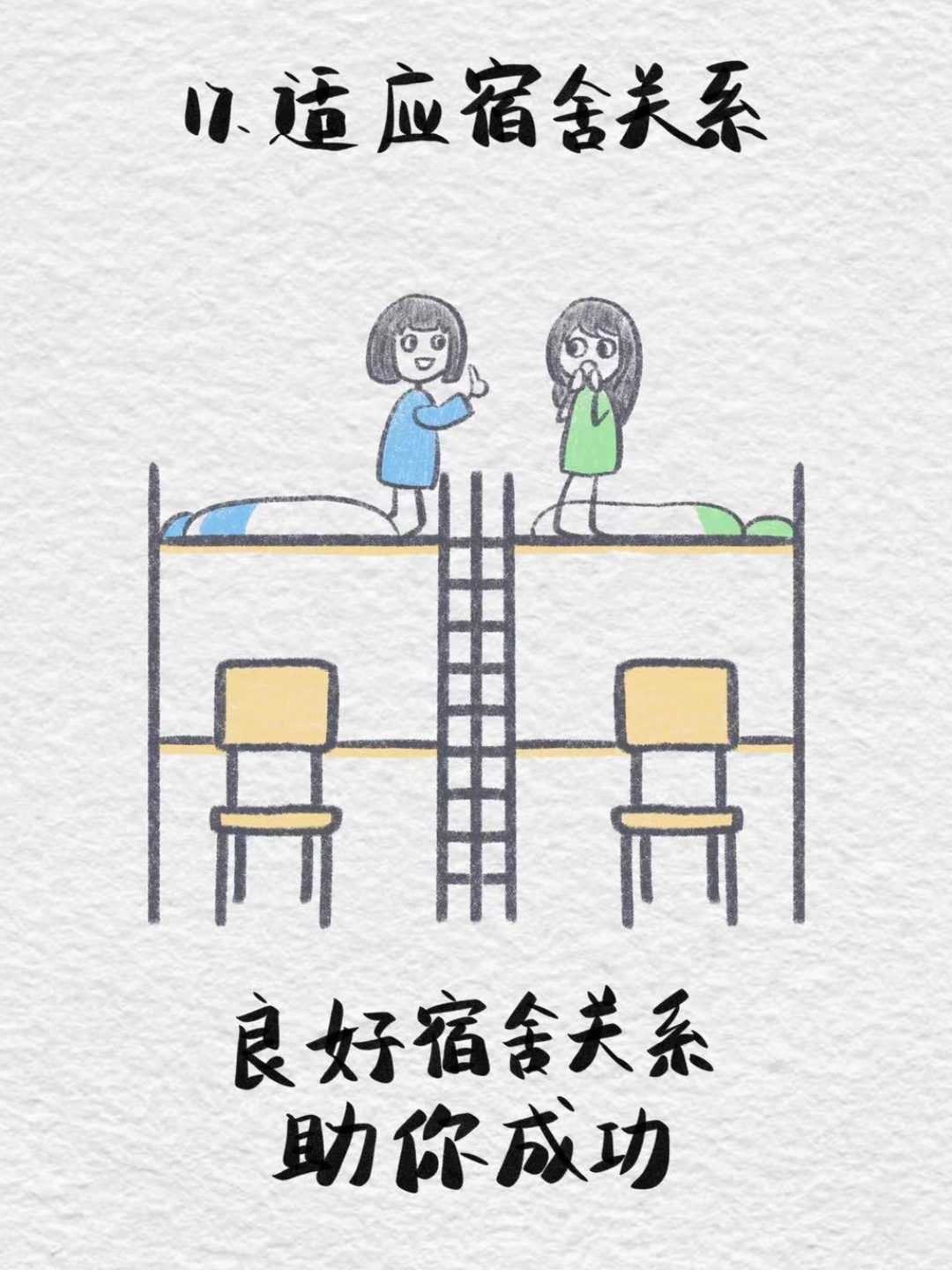 17.适应宿舍关系。大学里的寝室关系会影响你的学习🦦、生活、心态各个方面。你们都听说过“学霸宿舍”“学渣宿舍”,良好的宿舍关系一定会助你成功。你们来自不同城市、不同家庭背景、有着不同性格,因此处事方式、生活方式也各有不同,不要试图说服其它人和你一样🤦🏽♀️,你没有权力要求别人和你一样👰🏼♂️,你只能试着去适应🏋️♀️。