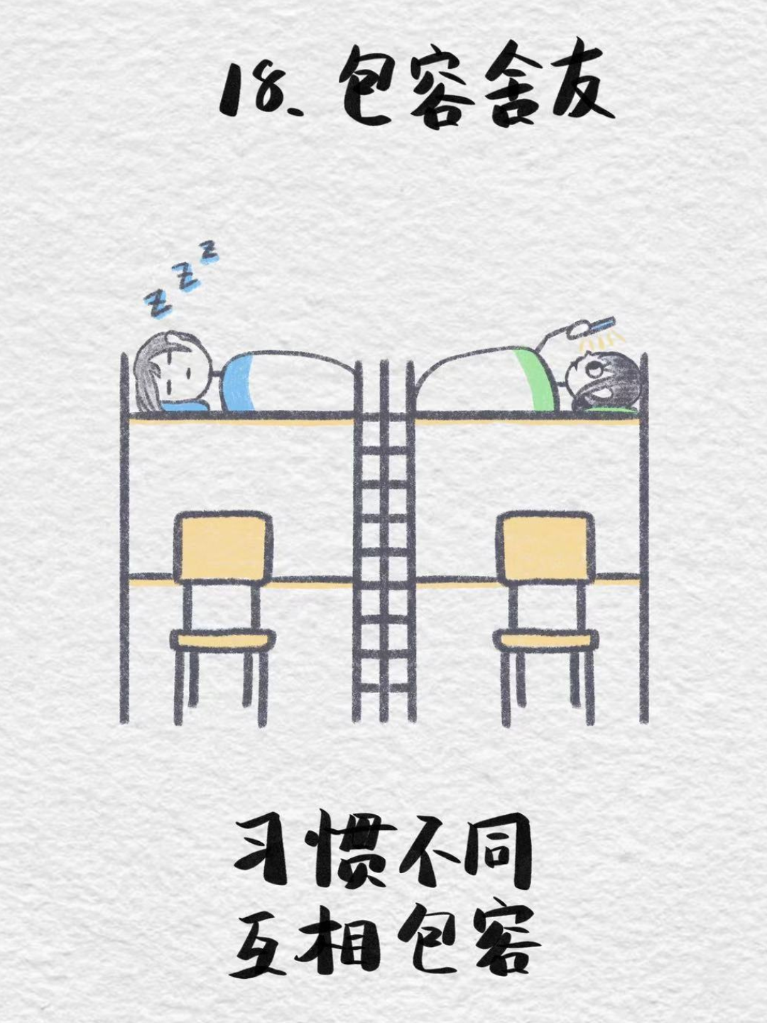 18.包容舍友🛌。要学会和你生活习惯完全不同的室友一起生活🧎🏻➡️,不会刚好一个宿舍的所有人都有一样的睡眠模式,学习习惯以及卫生要求🙍🏽♂️,这时候你能做的只能是互相包容♙。学着和他们成为朋友。有的人是不太会考虑别人的感受,不过大部分时候,你的室友也是这样评价你的🧑🏻🦯。最后这些室友会成为你难忘的校友。