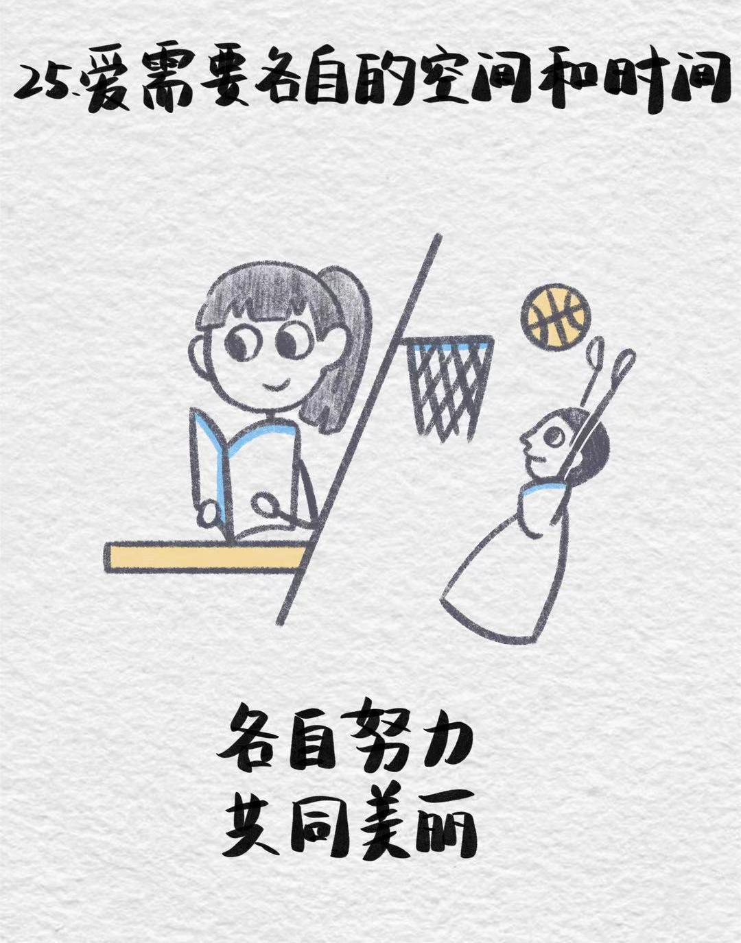 25.爱需要各自的空间和时间🏌️♀️。不要觉得恋爱后一定要天天黏在一起📦,不要觉得天天在一起秀恩爱别人会羡慕你。更不要在教室、图书馆、食堂等公共场合秀恩爱,这样只会让人觉得你不懂事。给予对方更多时间和空间去做该做的事情。甚至鼓励对方多与不同人交往🏃♀️➡️🤭,多参加更有意义的活动。要知道🏧,你控制得越紧,对方跑得越快。还有就是你们懂得的🙄,天天在一起哪还有新鲜感。其实🧥,我最想表达的意思是✌🏼:你们恋爱,各自努力,各自有自己的人际圈子,互相督促🏋🏻♂️🦪,积极上进。