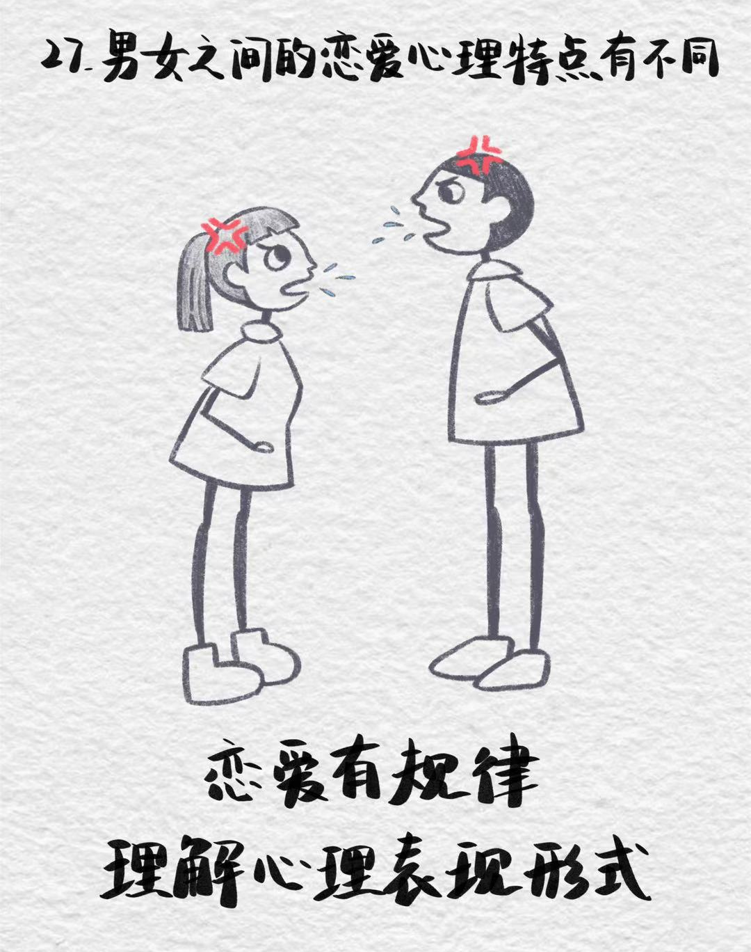 27.男女之间的恋爱心理特点是不一样的。很多同学不懂恋爱规律,对男女之间恋爱的心理特点不了解,对恋爱双方的心理需求不理解🫚,对恋爱双方出现的特殊心理表现形式不理解,不能正确看待交往中出现的种种心理现象,甚至产生很多误解。这时候建议同学们多看看书,多多了解男女之间的心理特点。