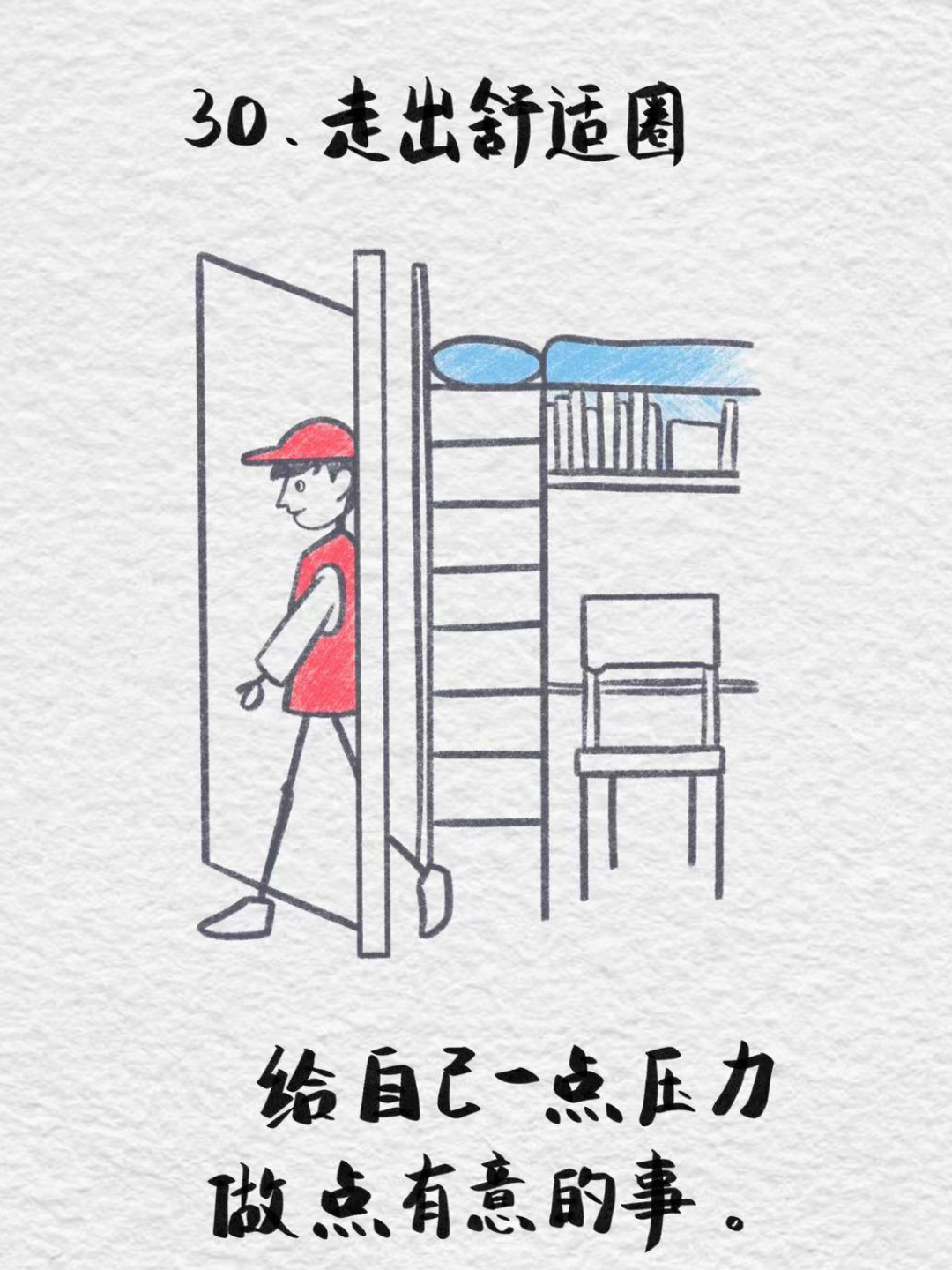 30.走出舒适圈。上大学是踏出舒适圈的好时机,在家受到各种“诱惑”无法收心🪿,无法自律,请同学们上大学后尽快走出舒适圈。不要等到期末了才想起要读书🖨,不要等到生病了才想起要锻炼身体🪵,不要等到你身边的同学一个个都变优秀你才想起要去锻炼能力🧻,不要等到大家都准备考研了你还在思考要不要考研。走出自己的舒适圈吧,给自己一些压力🧔,做点有意义的事情🧑🦼,图书馆☠️、运动场🪽、活动现场你应该常去。