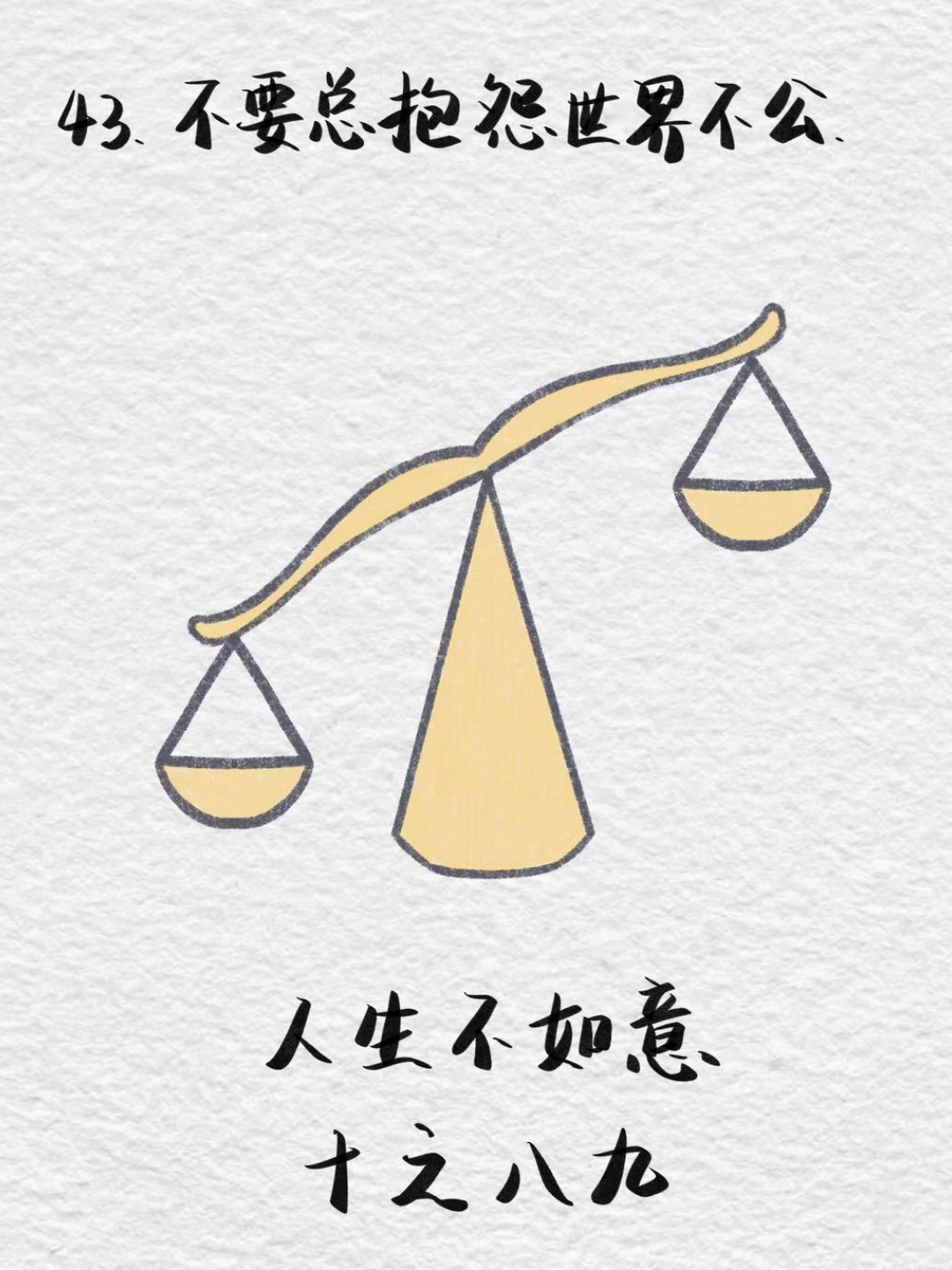 43.不要总抱怨世界不公平。大学就是一个小社会,你可能会发现一些不公平,也会发现不少你看不惯的东西⛴,人生不如意十之八九,这很正常👷🏻♀️。面对不公平的事情,不要抱怨,你所认为的不公平可能恰恰是别人的公平🤜🏿,所以,你不如去努力的奋斗,争取属于你的公平。一个人在一些地方获取了什么👷🏻,注定要在另一些地方失去些什么🙇🏼♂️,这只是时间的问题🧉。任何时候都要学会一分为二的看待问题,不要钻牛角尖,记住该记住的🧕🏼,忘记该忘记的,改变能改变的,接受不能改变的,用智慧去分辨两者;时刻保持微笑👌🏻,它会为你带来幸运🩰。