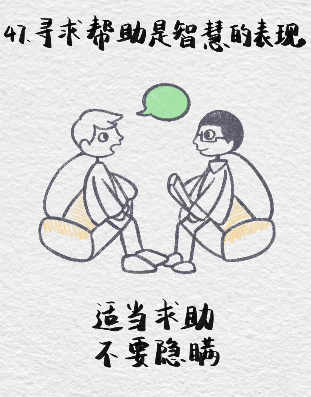47.寻求帮助是智慧的表现。国家卫健委发布的心理健康素养十条中,有一条明确说明,懂得求助是一个人智慧的表现。如果你有心理困惑,要根据自己的情绪表现和症状特点,适时适当的求助,不要隐瞒疾病,也不要扩大疾病的症状,及时寻求专业帮助🙆。