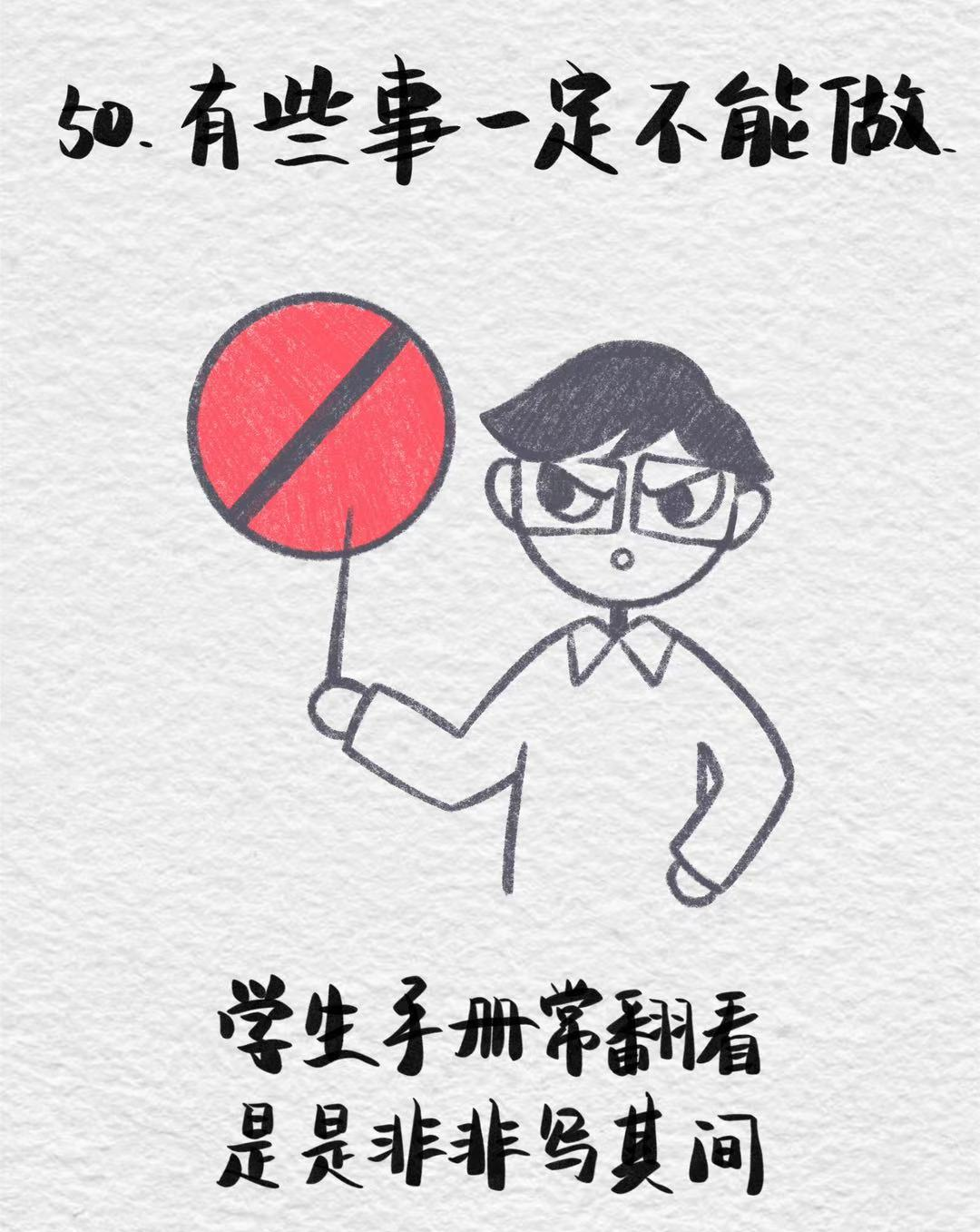 50.有些事一定不能做。一定不能考试作弊,任何高校在这方面的惩处力度都是很严厉的,你一定不希望自己考试作弊被抓的记录写进你的档案😽,或者是被退学,诚实守信是做人的根本🕗🔜;一定不能不注意自己的健康,不珍惜自己的生命🛏,要爱护自己珍惜自己👉🏼,这是很重要的!因为没有什么比失去健康、失去生命更令人心痛了;无论何时都不要自暴自弃;不要去破坏别人的家庭🛁,你们应该明白我要表达的意思💁🏽♂️;不做违法的事情🧘🏽,一旦你做了违法的事,学校一定会给予你严厉的处分,甚至直接开除学籍;再没钱也不要涉足校园贷🫲🏿🧛🏽♀️,这个无底洞你惹不起,一旦沾上👨🌾,后患无穷,切记远离校园贷;你有再多的怨气💧,也要控制自己的情绪,不可伤害别人🫴🏽,这可能会酿成大祸🤚,情绪失控时🤶🏼🧒🏻,先停下来,平静下来。