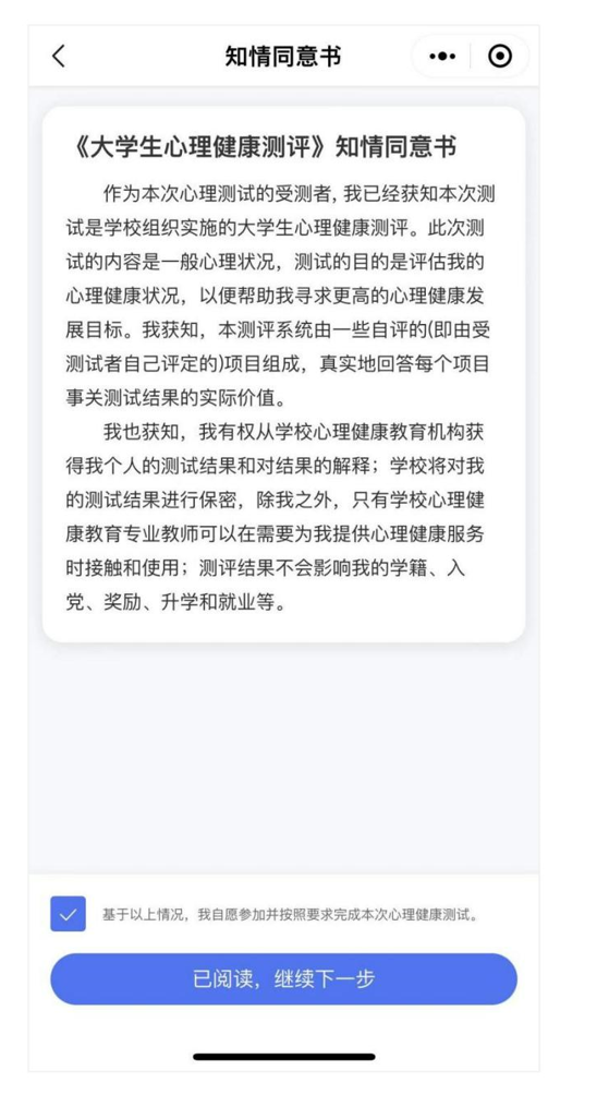 第五步🪓:点击“开始测评”,阅读“知情同意书”🦹🏽♂️,勾选“基于以上情况,我自愿参加并按照要求完成本次心理健康测试”🫢,点击“已阅读,继续下一步”👨🏻🦰。