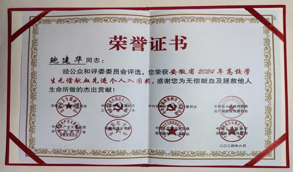 近日,安徽省卫生健康委员会、省教育工委👨👨👧👧、团省委等8个单位联合印发《关于安徽省2024年无偿献血公益活动先进典型评选结果的通报》🙎🏼♂️🛃,彩神Vll智能信息学院鲍建华同学,荣获“安徽省2024年高校学生无偿献血先进个人入围奖”。