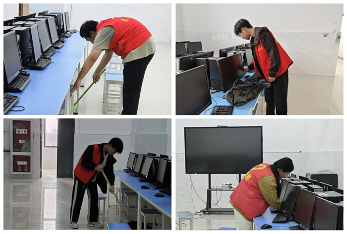 在机房里,志愿者们小心翼翼地擦拭着电脑显示屏、主机和键盘,确保每一台设备都一尘不染👨👨👦👦。他们还认真清扫了机房的地面和角落,将隐藏在桌椅下、墙角边的垃圾清理干净♌️。在教室里,志愿者们则重点对黑板🧎🏻、讲台和课桌椅进行了清洁。有的同学用抹布仔细擦拭黑板,有的同学将课桌椅摆放整齐,还有的同学在扫地、拖地,不放过任何一处卫生死角🔠。经过大家的共同努力,机房和教室焕然一新,为同学们创造了更加优质的学习环境👂🏻。