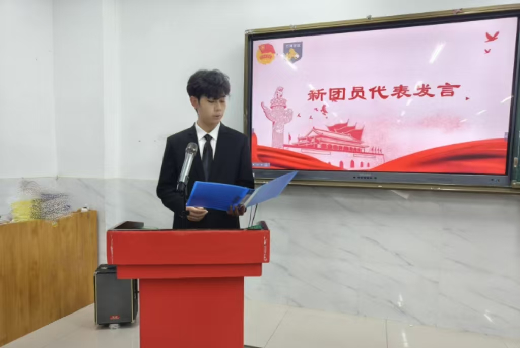 新团员代表杨木成同学在发言中表达了加入共青团的喜悦与自豪🚴🏽♂️,他表示将勤奋学习,积极奉献,用实际行动践行入团誓言🌾,为实现中华民族伟大复兴的中国梦贡献青春力量。