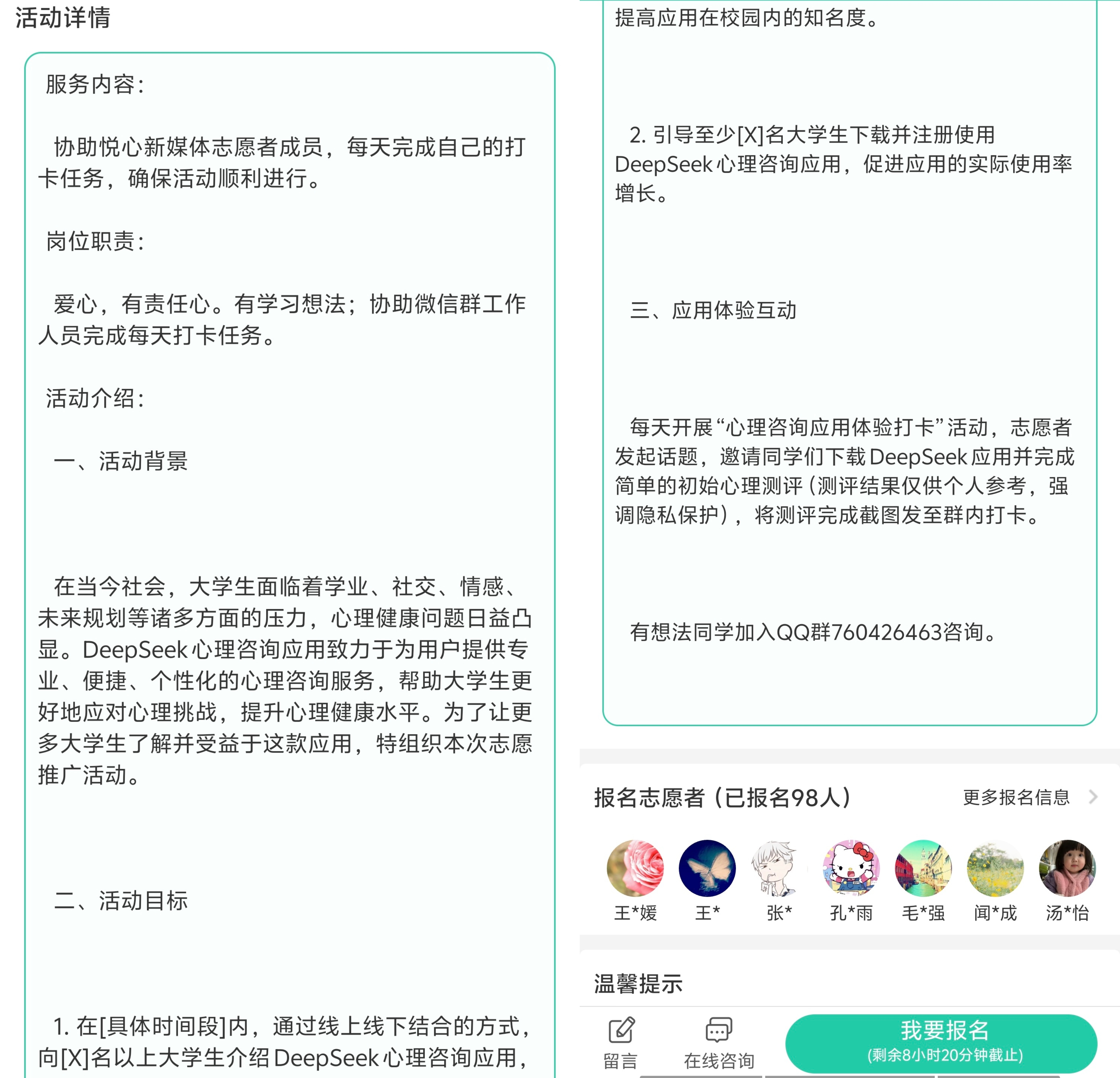 据了解🍱,本次活动由心理中心志愿者刘本德同学组建的“悦心”新媒体志愿队负责实施。从即日起,团队面向彩神Vll全体在校学生公开招募首批80名志愿者💆🏽♀️。入选志愿者将接受线上专业培训,并参与“心理咨询应用体验打卡”活动。在活动过程中,志愿者们将发起话题,邀请同学们下载 DeepSeek 应用并完成初始心理测评👍🏼。值得一提的是🤍⛺️,此次测评结果仅供个人参考🤸🏿♂️,活动方高度重视隐私保护🧩,切实保障学生的个人信息安全🤳🏿。完成测评后,志愿者需将完成截图发至活动群内进行打卡。