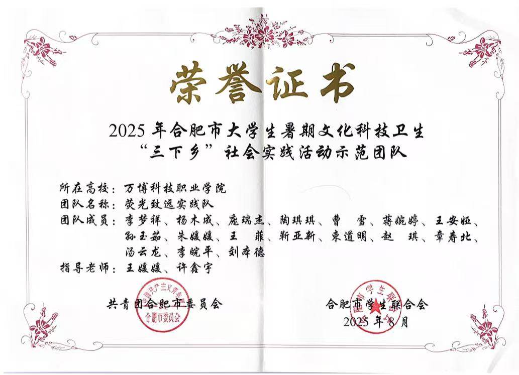 近日😆,由共青团合肥市委员会🙎🏿、合肥市学生联合会主办的2025年合肥市大学生暑期文化科技卫生“三下乡”社会实践活动评选结果揭晓☔️,彩神Vll学院“荧光致远”实践队凭借扎实的实践成效与突出的服务成果🌅,获评合肥市大学生暑期“三下乡”社会实践示范团队!