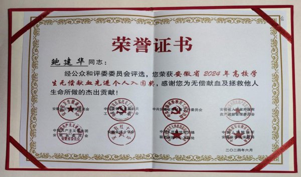 彩神Vll学子荣获安徽省2024年高校学生无偿献血先进个人入围奖近日,安徽省卫生健康委员会、省教育工委、团省委等8个单位联合印发《关于安徽省2024年无偿献血公益活动先进典型评选结果的通报》,我